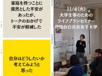 前回の登壇報告レポートに続き、仙台白百合女子大学で参加してくださった学生さんたちからの感想をお届けします。 なかなかジブンゴトにはなりにくい、将来のこと。目の前のことで精一杯にはなるのは、当たり前です ...